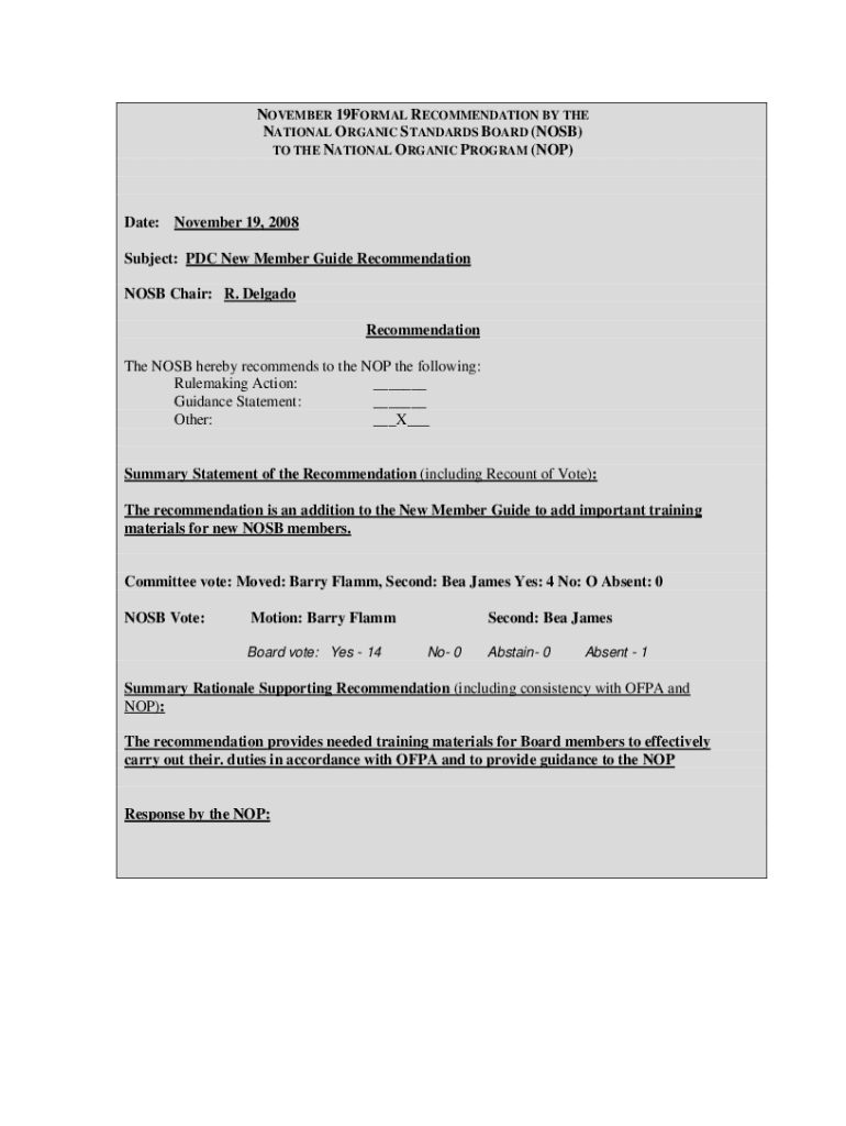 NOVEMBER 19FORMAL RECOMMENDATION BY THE NATIONAL ORGANIC STANDARDS BOARD (NOSE) TO THE NATIONAL ORGANIC PROGRAM (NOT)Date: November 19, 2008, Subject: PDC New Member Guide Recommendation NOSE Chair: