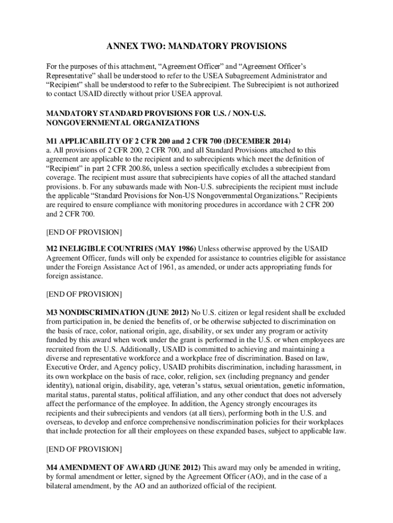 ANNEX TWO: MANDATORY PROVISIONS For the purposes of this attachment, Agreement Officer and Agreement Officers Representative shall be understood to refer to the USED Subagreement Administrator and