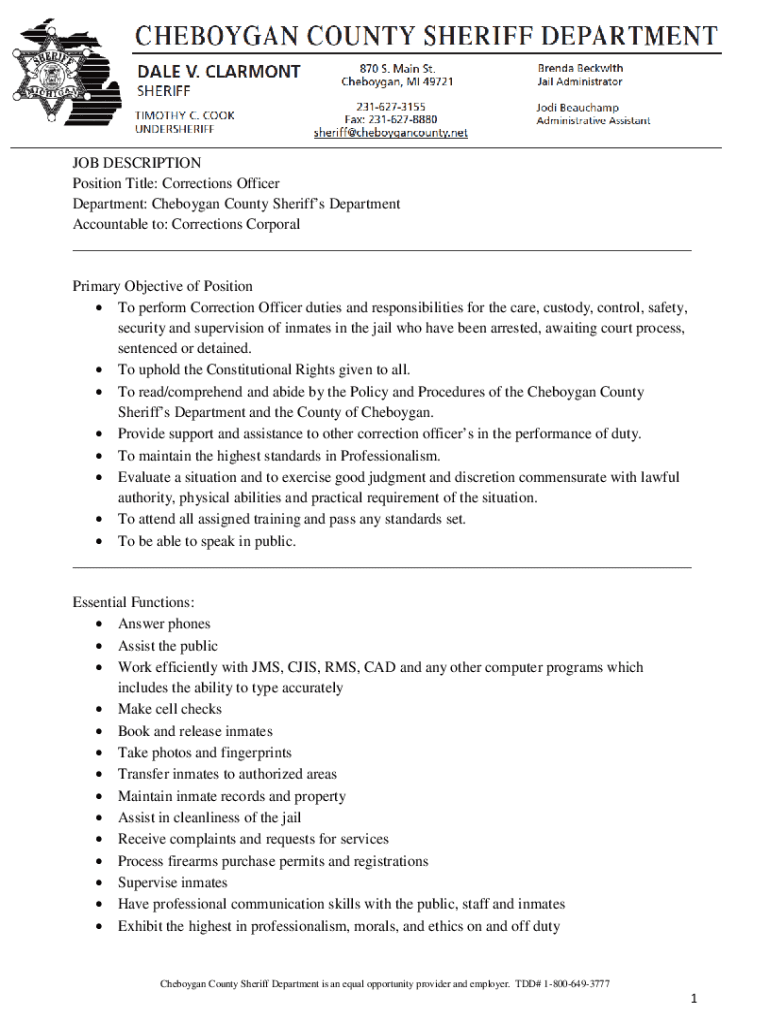 JOB DESCRIPTION Position Title: Corrections Officer Department: Sheboygan County Sheriffs Department Accountable to: Corrections Corporal ___ Primary Objective of Position To perform Correction Officer