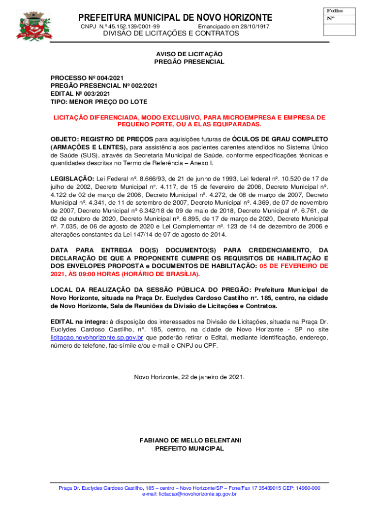 PREFECTURE MUNICIPAL DE NOVA HORIZONTAL
