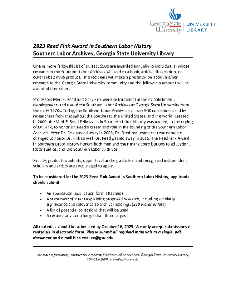 2023 Reed Fink Award in Southern Labor History Southern Labor Archives, Georgia State University Library One or more fellowship(s) of at least $500 are awarded annually to individual(s) whose research