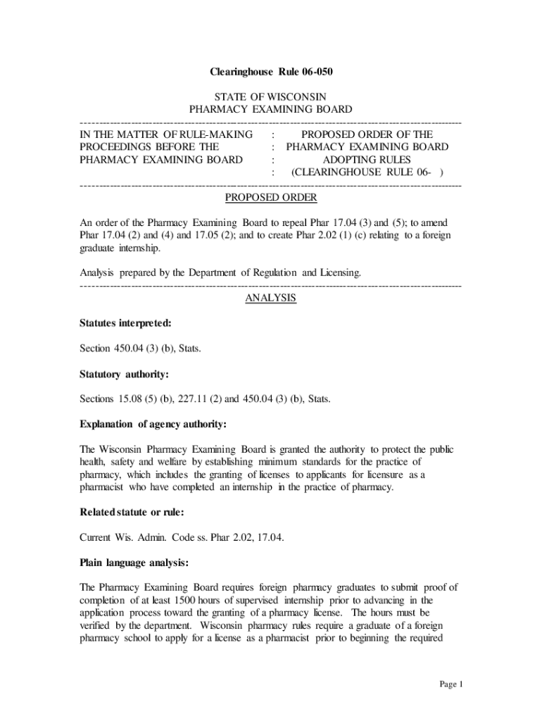 Clearinghouse Rule 06050 STATE OF WISCONSIN PHARMACY EXAMINING BOARD IN THE MATTER OF REMAKING : PROPOSED ORDER OF THE PROCEEDINGS BEFORE THE : PHARMACY EXAMINING BOARD PHARMACY EXAMINING BOARD :