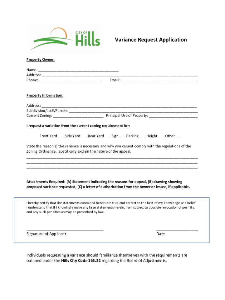 Variance Request Application Property Owner: Name: ___ Address: ___ Phone: ___ Email: ___Property Information: Address: ___ Subdivision/Lot#/Parcels: ___ Current Zoning: ___ Principal Use of Property: