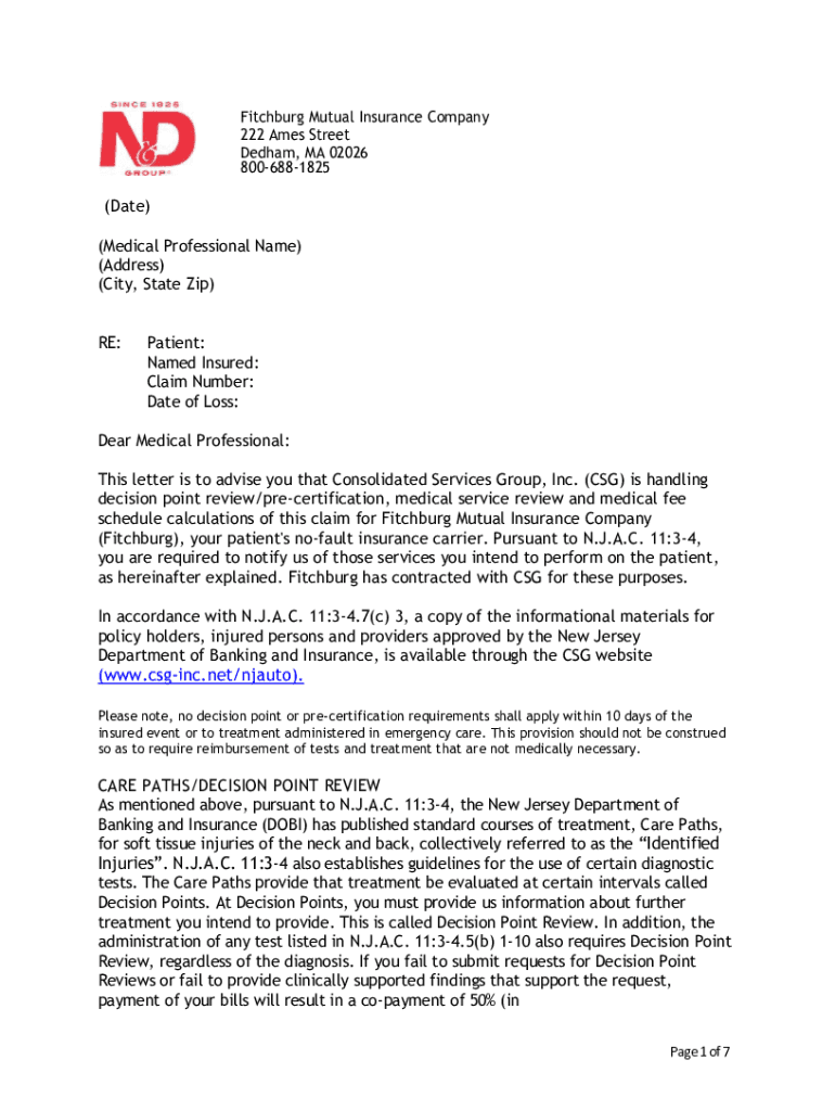 Fitchburg Mutual Insurance Company 222 Ames Street Durham, MA 02026 8006881825(Date) (Medical Professional Name) (Address) (City, State Zip) RE:Patient: Named Insured: Claim Number: Date of Loss:Dear