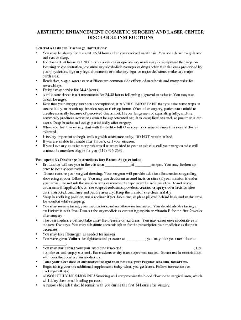 AESTHETIC ENHANCEMENT COSMETIC SURGERY AND LASER CENTER DISCHARGE INSTRUCTIONS General Anesthesia Discharge Instructions: You may be sleepy for the next 1224 hours after you received anesthesia. You