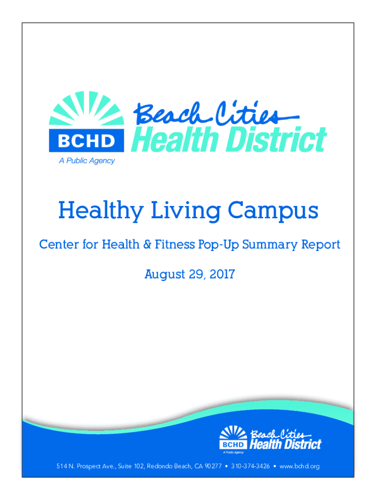 Healthy Living Campus Center for Health & Fitness Popup Summary Report August 29, 2017514 N. Prospect Ave., Suite 102, Redondo Beach, CA 90277 3103743426 www.bchd.orgTable of Contents 1 INTRODUCTION..................................................................................................................................................