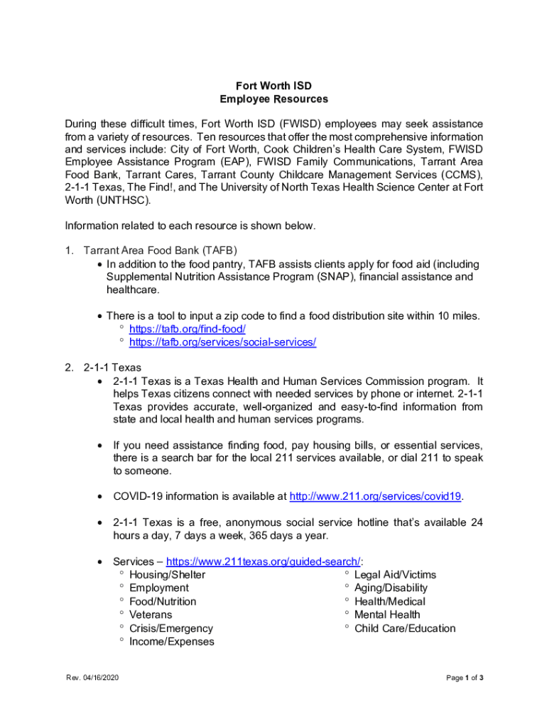 Fort Worth ISD Employee Resources During these difficult times, Fort Worth ISD (FWI SD) employees may seek assistance from a variety of resources. Ten resources that offer the most comprehensive information