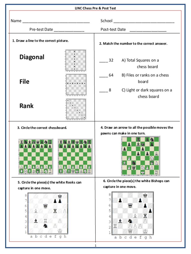 LINE Chess PRE & Post Testate ___School ___Pretest Date ___Posttest Date ___1. Draw a line to the correct picture.2. Match the number to the correct answer. Diagonal___ 32A) Total Squares on a
