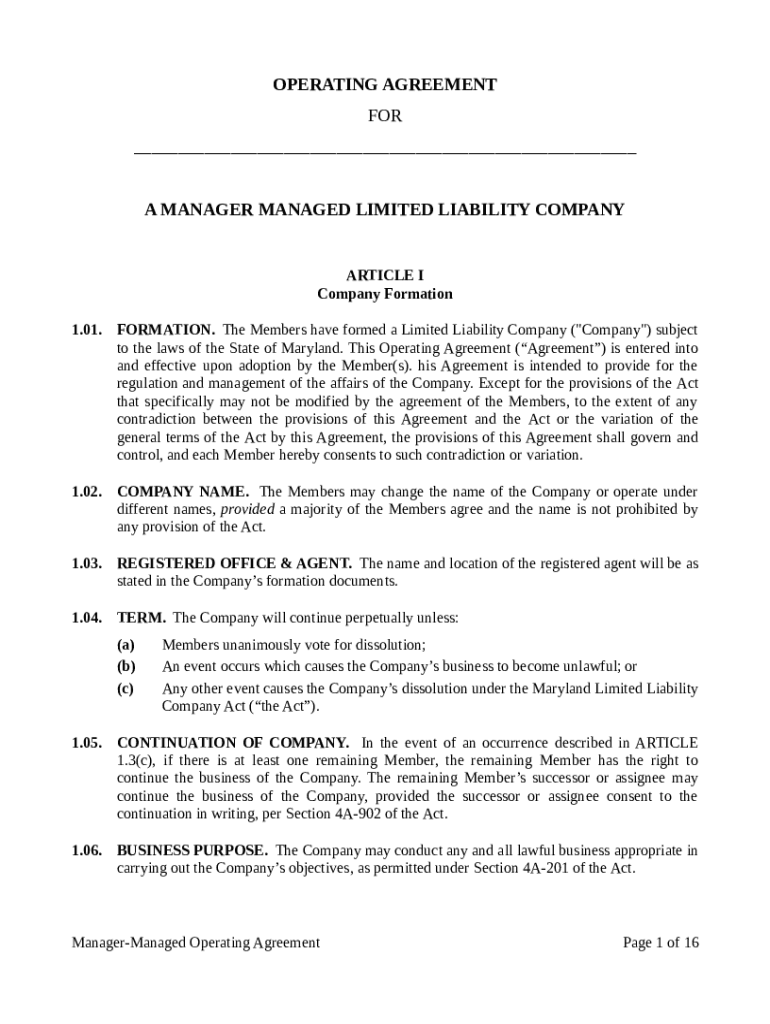 OPERATING AGREEMENT FOR ___ A MANAGER MANAGED LIMITED LIABILITY COMPANYARTICLE I Company Formation 1.01.FORMATION. The Members have formed a Limited Liability Company (\” Company\”) subject to