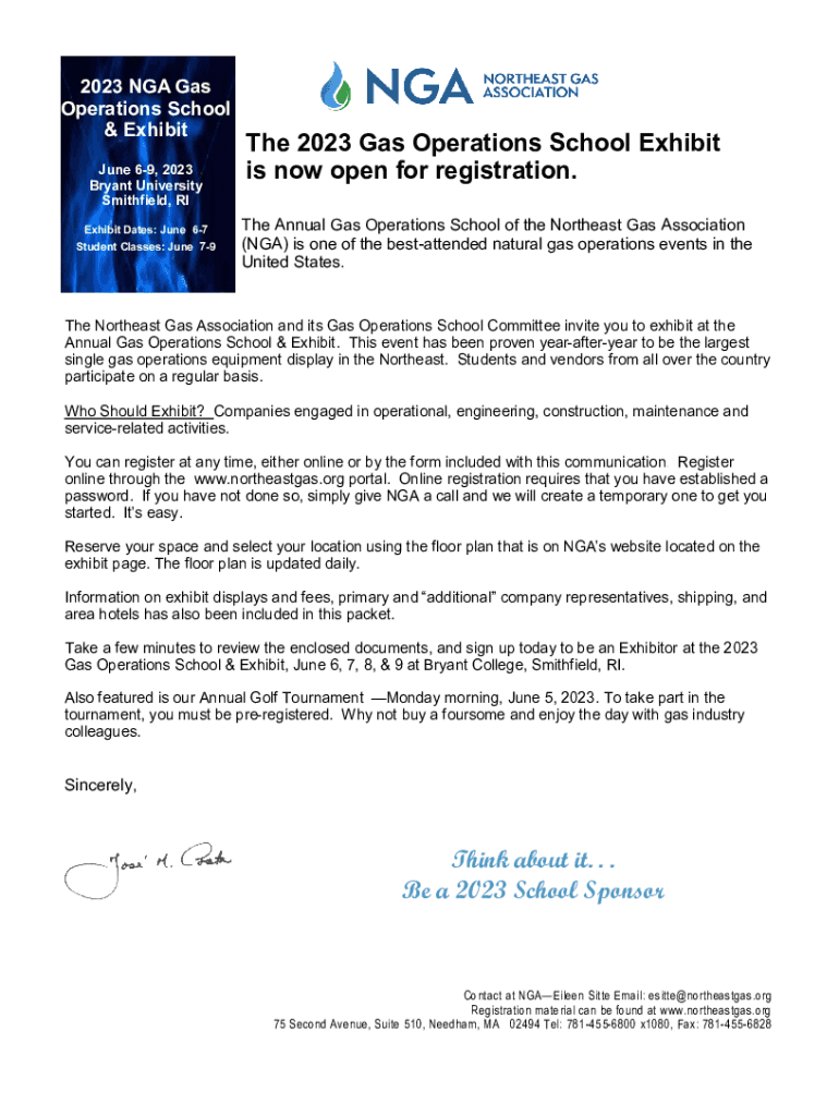 2023 NGA Gas Operations School & Exhibit June 69, 2023 Bryant University Smithfield, RI Exhibit Dates: June 67 Student Classes: June 79The 2023 Gas Operations School Exhibit is now open for registration.