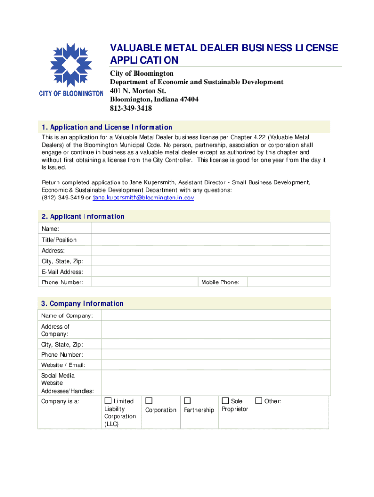 VALUABLE METAL DEALER BUSINESS LICENSE APPLICATION City of Bloomington Department of Economic and Sustainable Development 401 N. Morton St. Bloomington, Indiana 47404 8123493418 1. Application and