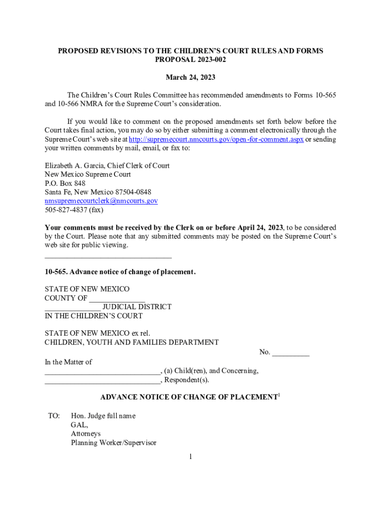 PROPOSED REVISIONS TO THE CHILDREN COURT RULES AND FORMS PROPOSAL 2023002 March 24, 2023, The Children's Court Rules Committee has recommended amendments to Forms 10565 and 10566 NMRA for the Supreme