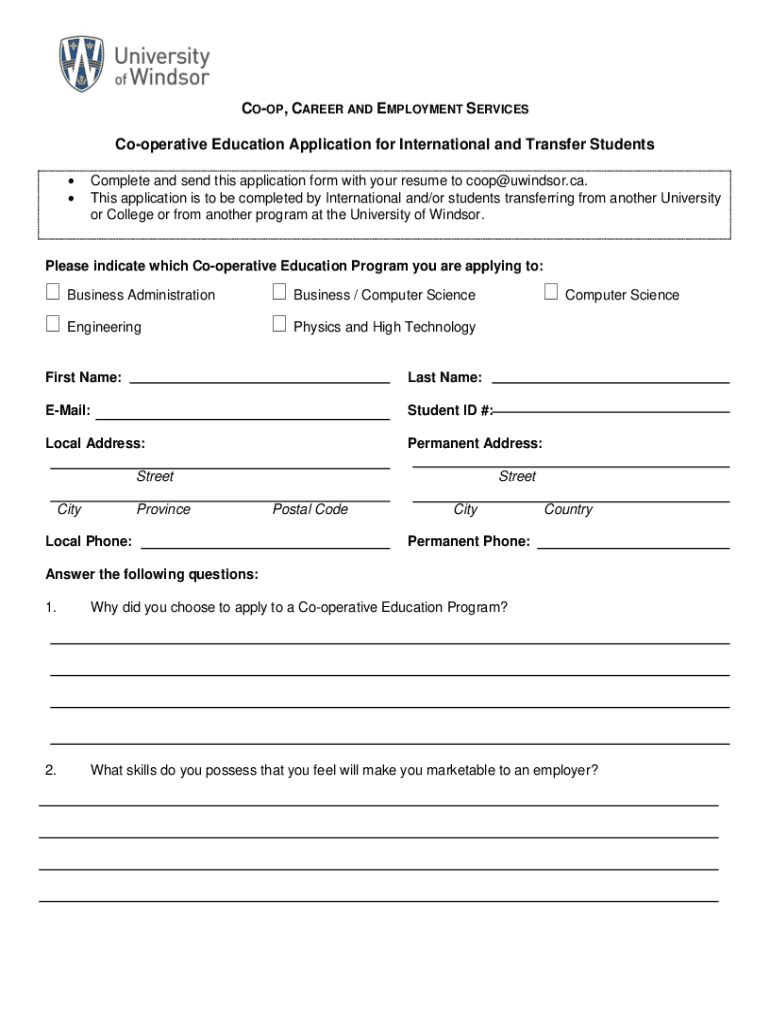 COOP, CAREER AND EMPLOYMENT SERVICES Cooperative Education Application for International and Transfer Students Complete and send this application form with your resume to coop@uwindsor.ca. This application