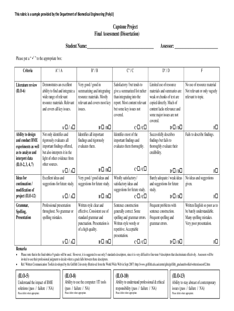 This rubric is a sample provided by the Department of Biomedical Engineering (Poly)BME41118 Capstone Project Final Assessment (Dissertation) Student Name:___Assessor: ___Please put a to the appropriate