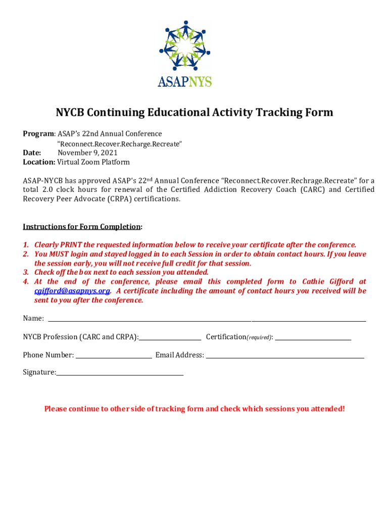 NYC Continuing Educational Activity Tracking Reprogram: ASAP 22nd Annual Conference \” Reconnect. Recover. Recharge. Recreate Date: November 9, 2021, Location: Virtual Zoom Platform ASAPNYCB has