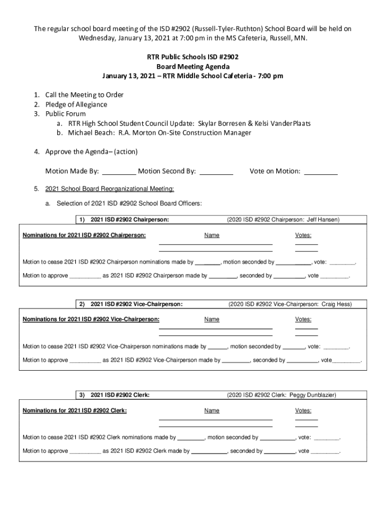 The regular school board meeting of the ISD #2902 (RussellTylerRuthton) School Board will be held on Wednesday, January 13, 2021, at 7:00 pm in the MS Cafeteria, Russell, MN. RTR Public Schools ISD