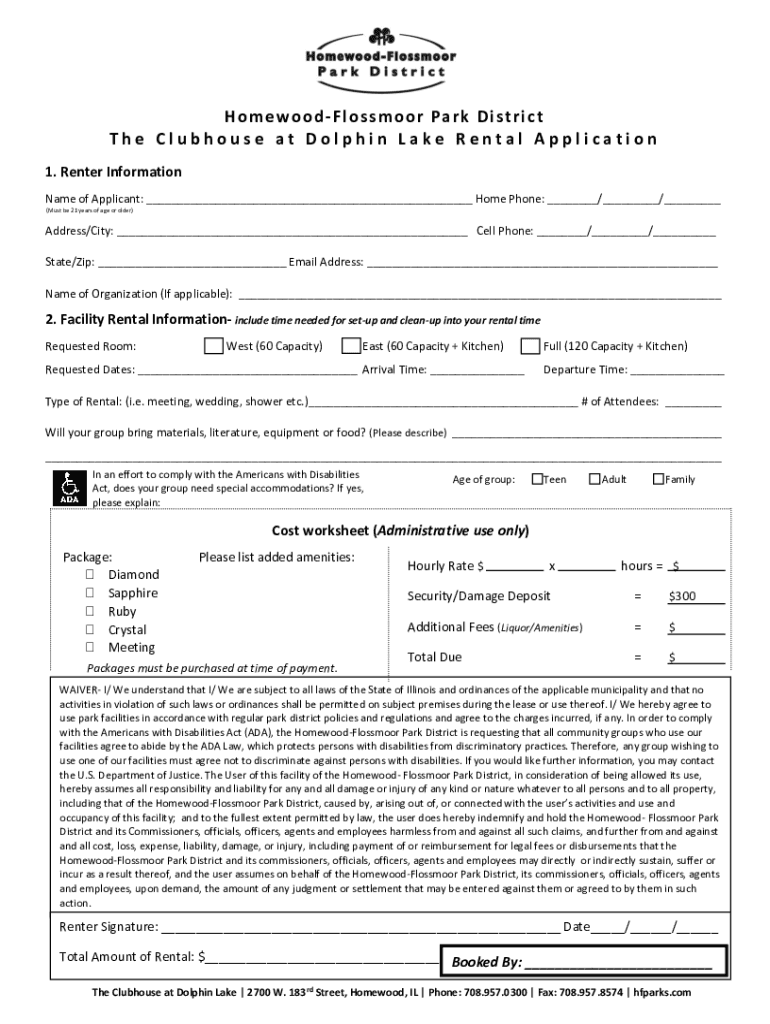 ___H o m e w o o d F l o s s m o o r Pa r k D i s t r i c t The Clubhouse at Dolphin Lake Rental Application 1. Renter Information Name of Applicant: ___ Home Phone: ___/___/___ (Must be 21 years