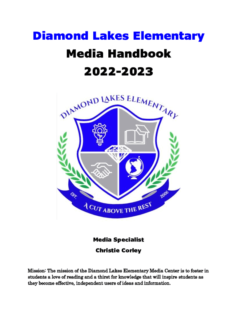 Diamond Lakes Elementary Media Handbook 20222023Media Specialist Christie CorleyMission: The mission of the Diamond Lakes Elementary Media Center is to foster in students a love of reading and a thirst