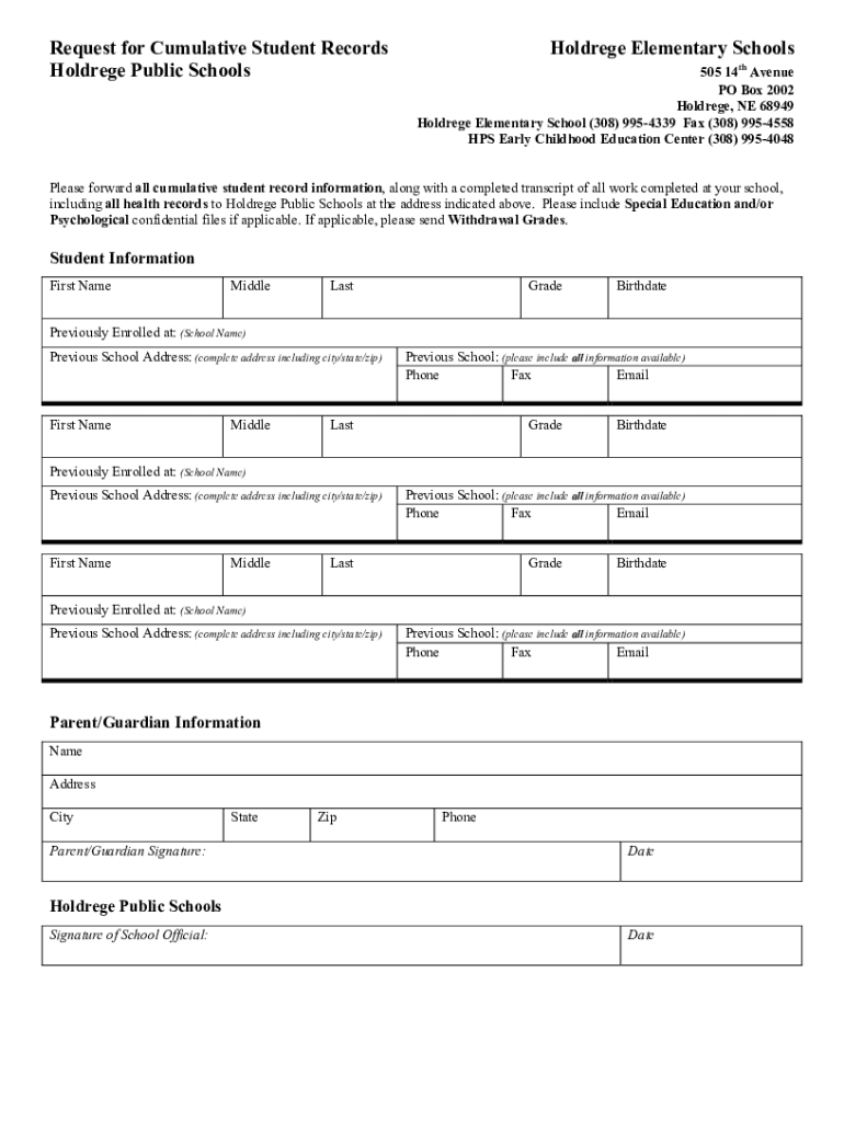 Get the free Request for Cumulative Student Records - Elementary School & PK 7 16 15.doc