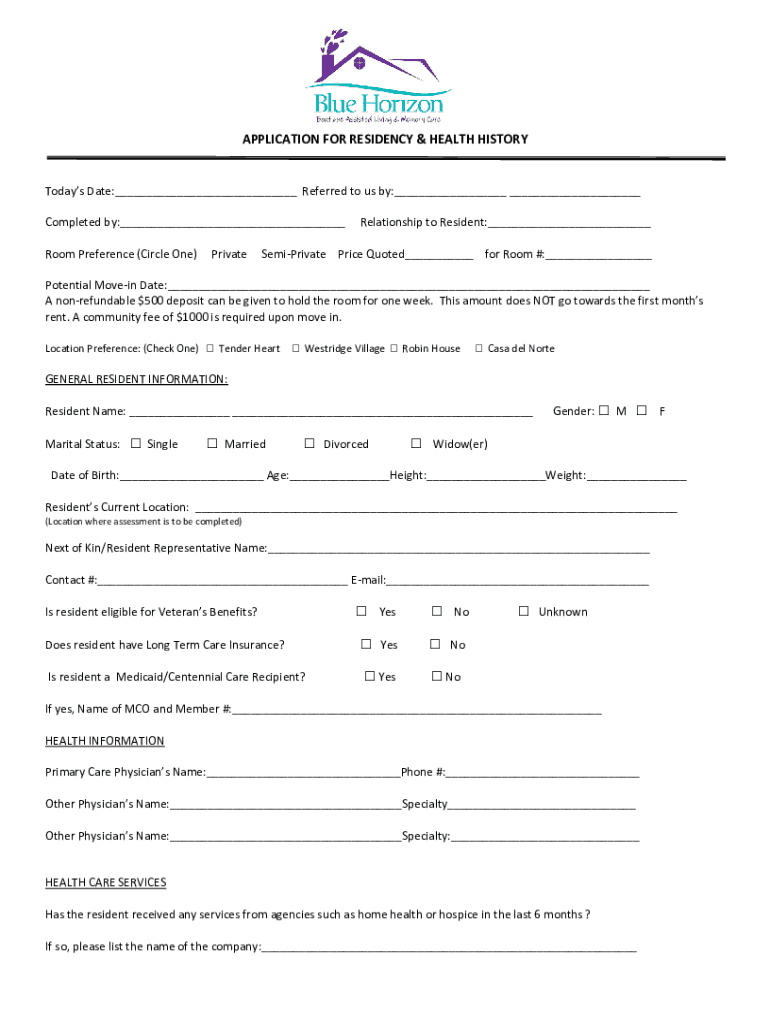 APPLICATION FOR RESIDENCY & HEALTH HISTORYTodays Date:___ Referred to us by:___ ___ Completed by:___ Room Preference (Circle One)PrivateRelationship to Resident:___Semiprivate Price Quoted___ for