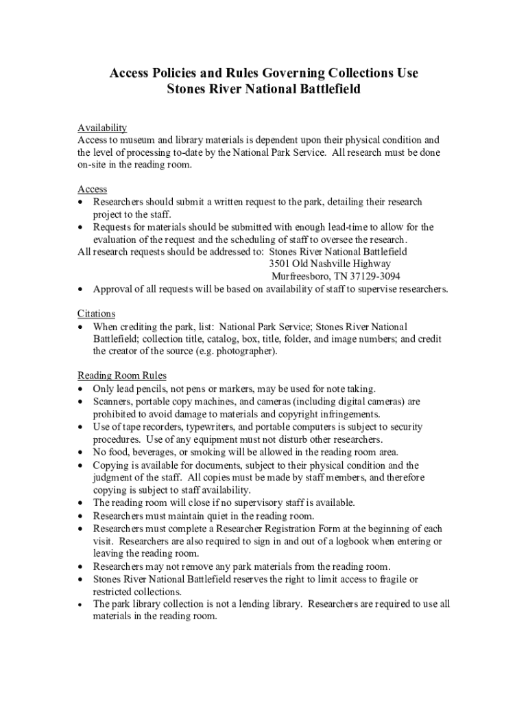 Access Policies and Rules Governing Collections Use Stones River National Battlefield Availability Access to museum and library materials is dependent upon their physical condition and the level of