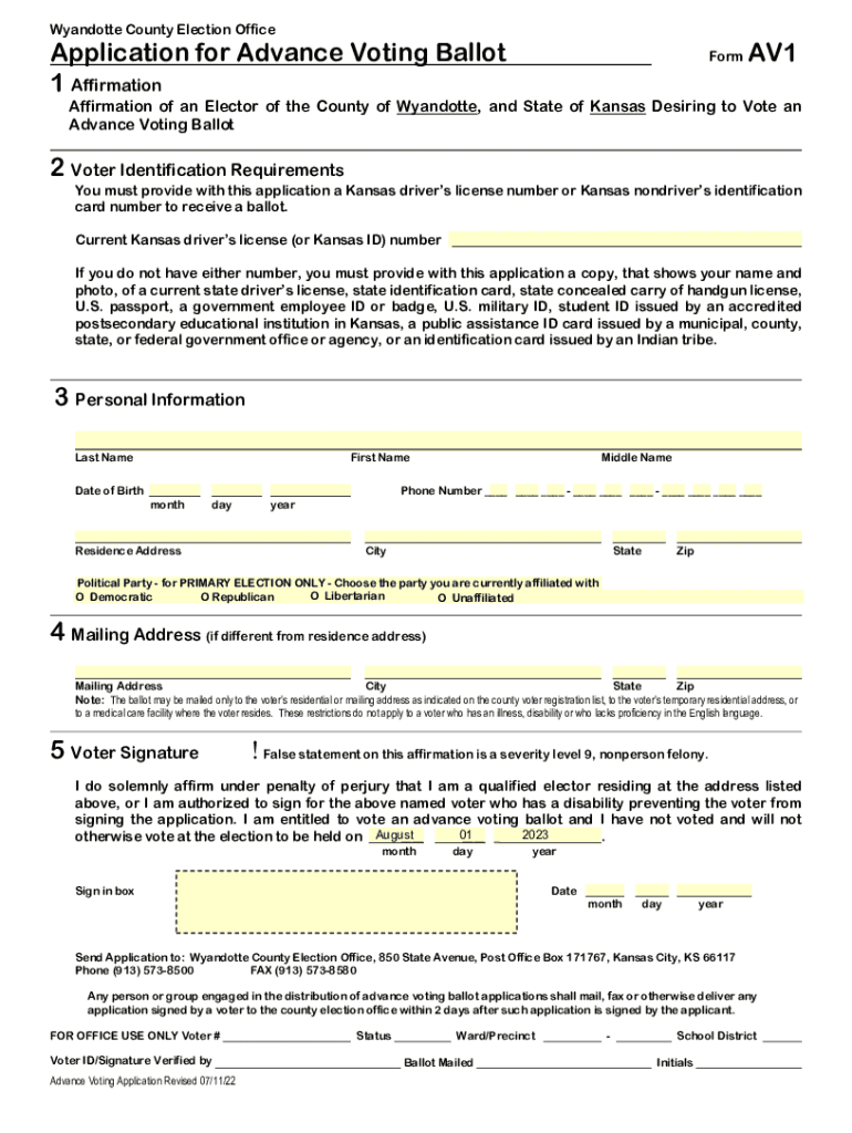 Wyandotte County Election OfficeApplication for Advance Voting Ballot 1 AffirmationFormAV1Affirmation of an Elector of the County of Wyandotte, and State of Kansas Desiring to Vote an Advance Voting