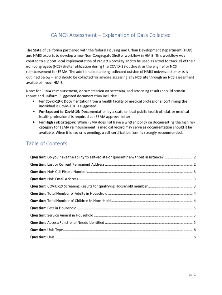 CA NCS Assessment Explanation of Data Collected The State of California partnered with the federal Housing and Urban Development Department (HUD) and HIS experts to develop a new Congregate Shelter