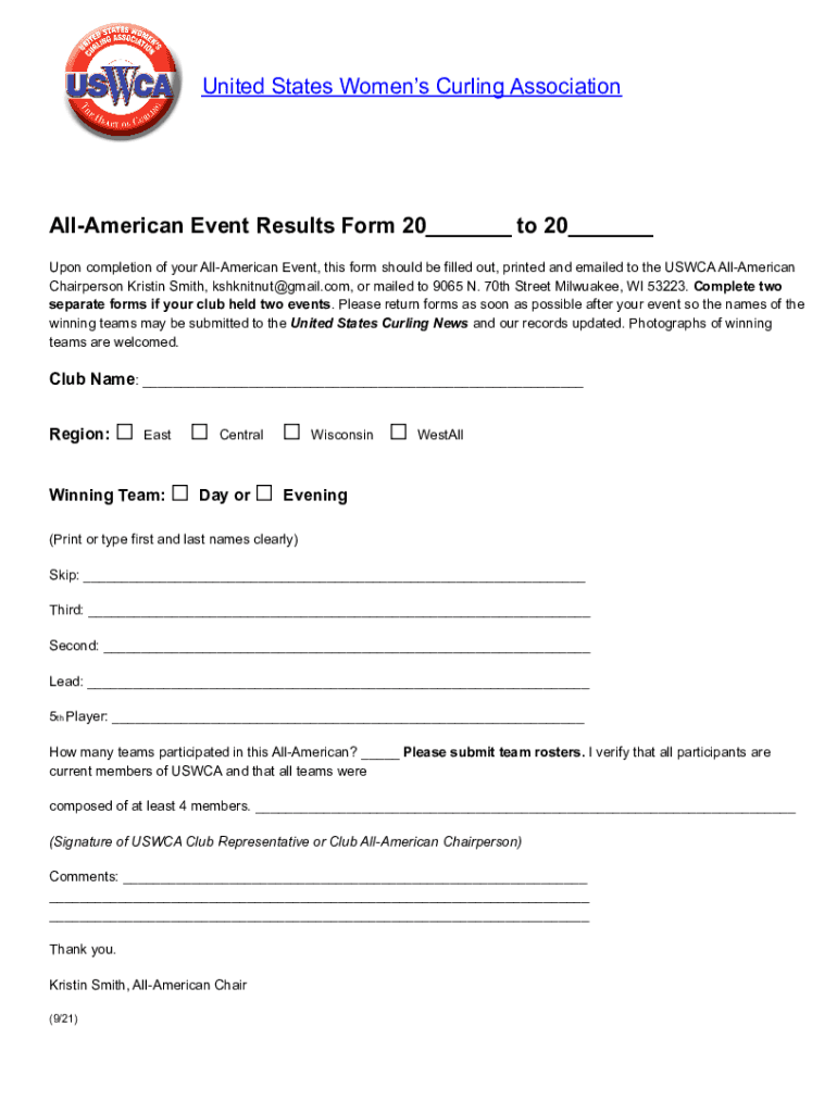 United States Women's Curling AssociationAllAmerican Event Results Form 20___ to 20___ Upon completion of your All American Event, this form should be filled out, printed and emailed to the USMCA