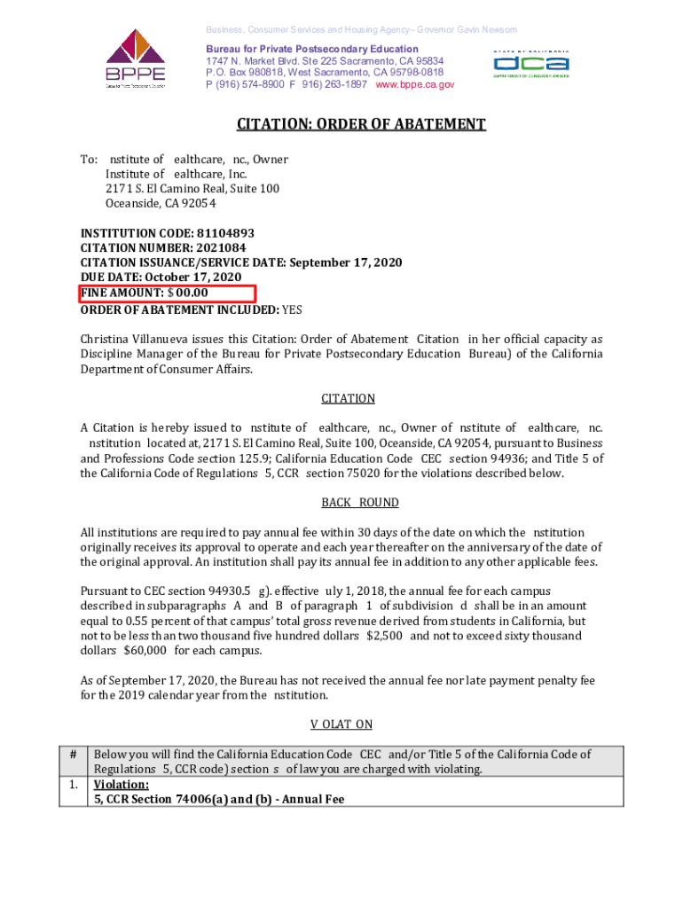 Get the free Bureau for Private Postsecondary Education - Institute of Healthcare, Inc. - Order o...