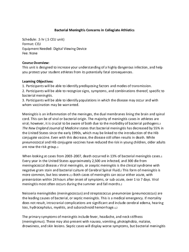 Bacterial Meningitis Concerns in Collegiate Athletics Schedule: .5 hr (.5 CEU unit) Format: CEU Equipment Needed: Digital Viewing Device Fee: None Course Overview: This unit is designed to increase