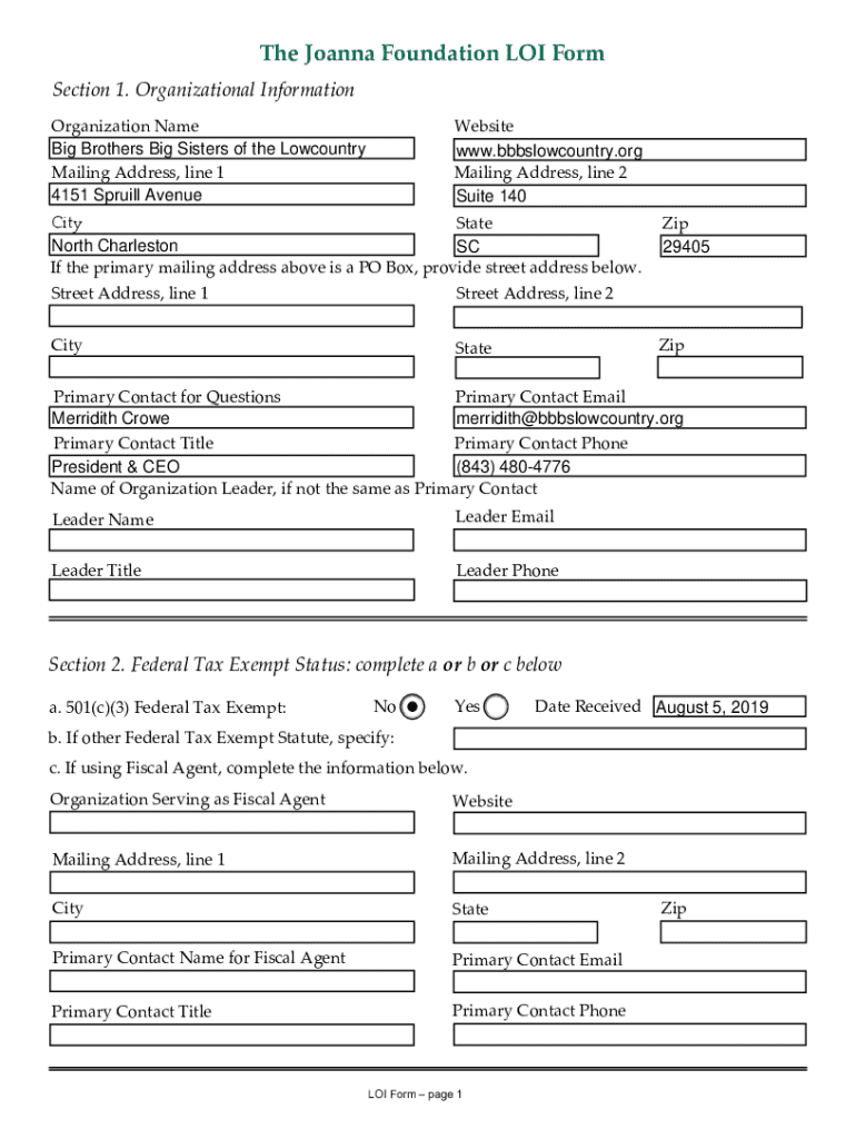The Joanna Foundation LOI Form Section 1. Organizational Information Organization Name Big Brothers Big Sisters of the Low country Mailing Address, line 1 4151 Spill AvenueWebsite www.bbbslowcountry.org