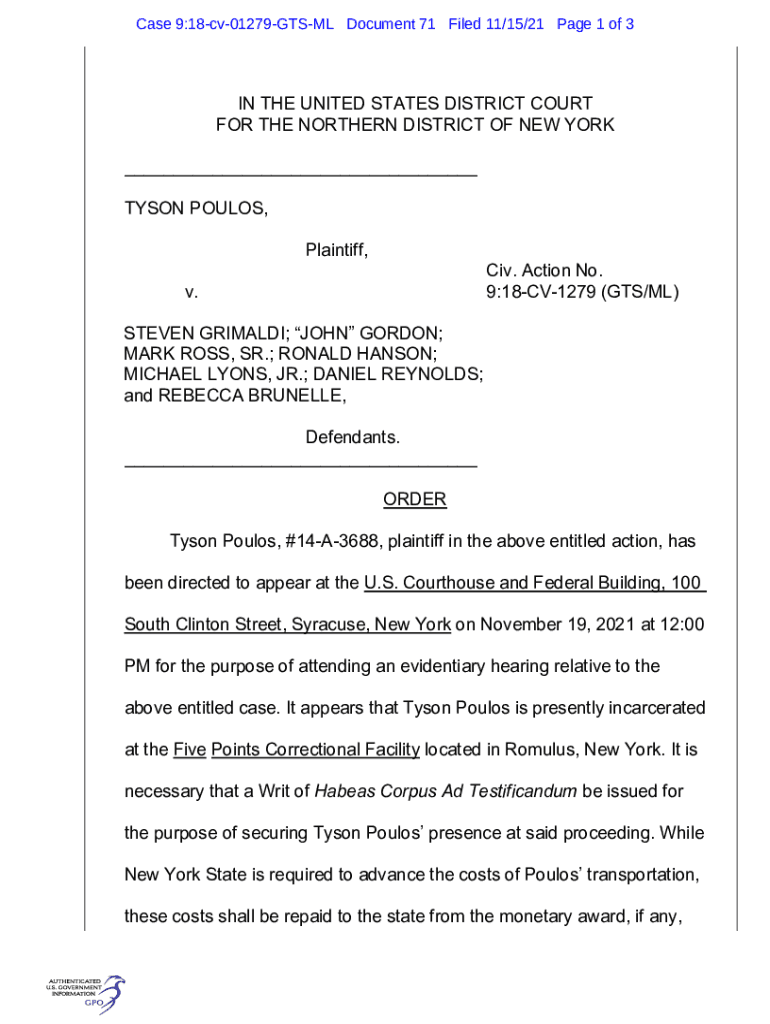 Case 9:18cv01279GTSML Document 71 Filed 11/15/21-Page 1 of 3IN THE UNITED STATES DISTRICT COURT FOR THE NORTHERN DISTRICT OF NEW YORK ___ TYSON POUNDS, Plaintiff, CIV. Action No. 9:18CV1279 (GTS/ML)v.