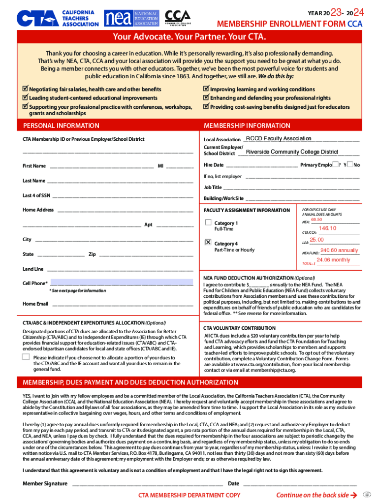 YEAR 20___ 23 20___ 24nea.orgNATIONALEDUCATIONASSOCIATIONMEMBERSHIP ENROLLMENT FORM Cavour Advocate. Your Partner. Your CTA. Thank you for choosing a career in education. While its personally rewarding,