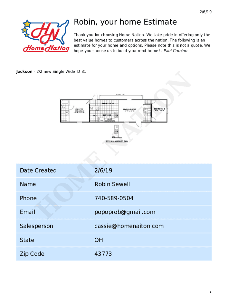 2/6/19Robin, your home Estimate Thank you for choosing Home Nation. We take pride in Goering only the best value homes to customers across the nation. The following is an estimate for your home and