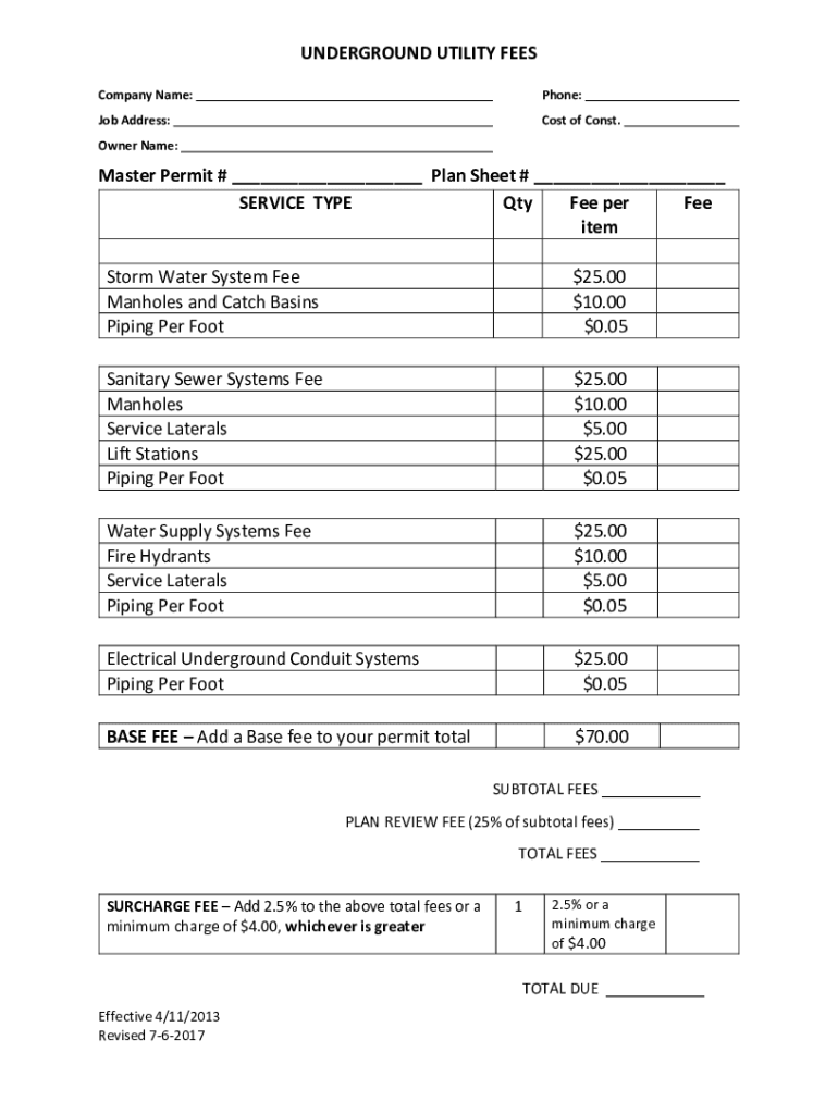 UNDERGROUND UTILITY FEES Company Name:Phone:Job Address:Cost of Coast. Owner Name:Master Permit # ___ Plan Sheet # ___ SERVICE TYPE Qty Fee per Fee item Storm Water System Fee Manholes and Catch Basins