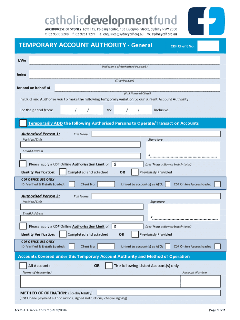 TEMPORARY ACCOUNT AUTHORITY General The Catholic Development Fund (CDF) has consolidated the previous Supplementary Account Authority form and Supplementary CDF Online Authority form into a single