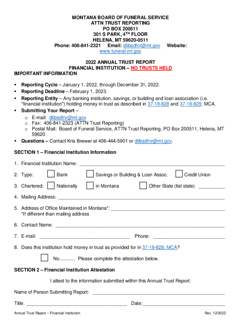 MONTANA BOARD OF FUNERAL SERVICE ATTN TRUST REPORTING PO BOX 200511 301 S PARK, 4TH FLOOR HELENA, MT 596200511 Phone: 4068412321 Email: dlibsdfnr@mt.gov Website: www.funeral.mt.gov 2022 ANNUAL TRUST