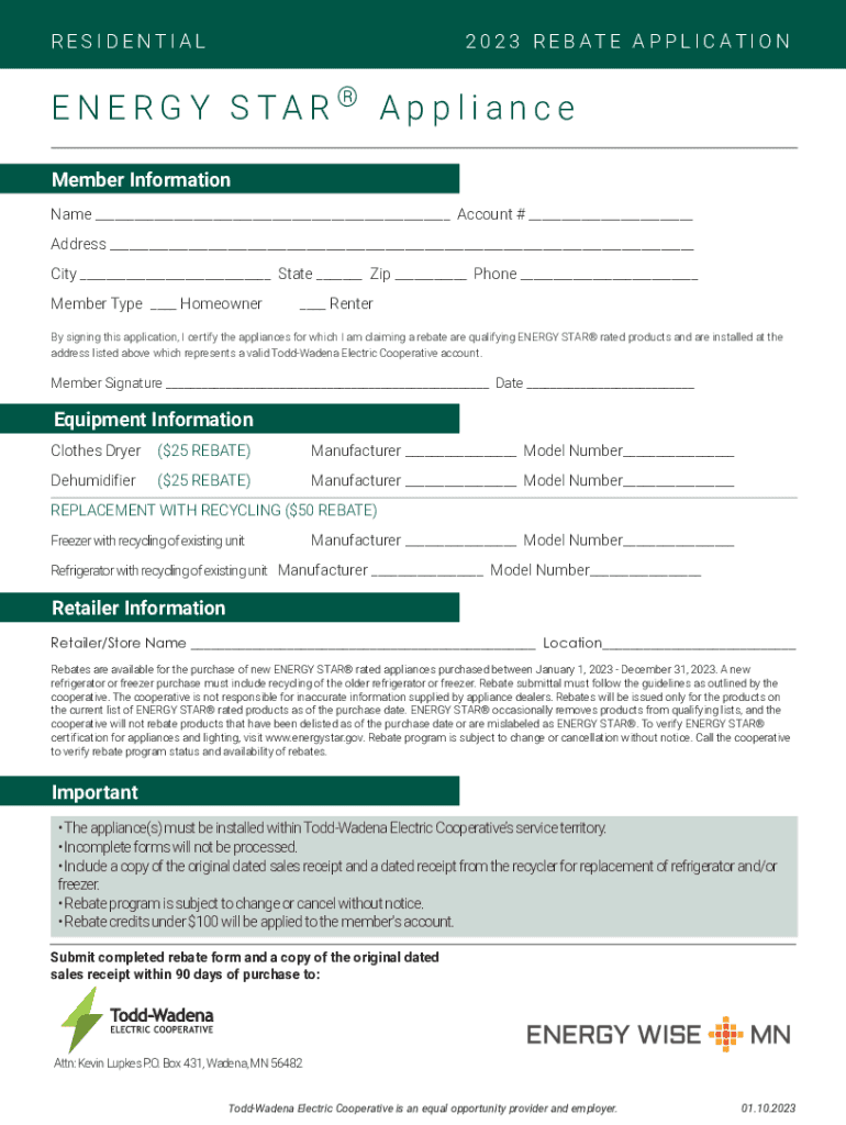 RESIDENTIAL2 0 2 3 R E B AT E A P P L I C AT I ON ENERGY STAR Appliance Member Information Name ___ Account # ___ Address ___ City ___ State ___ Zip ___ Phone ___ Member Type ___ Homeowner___ Renters