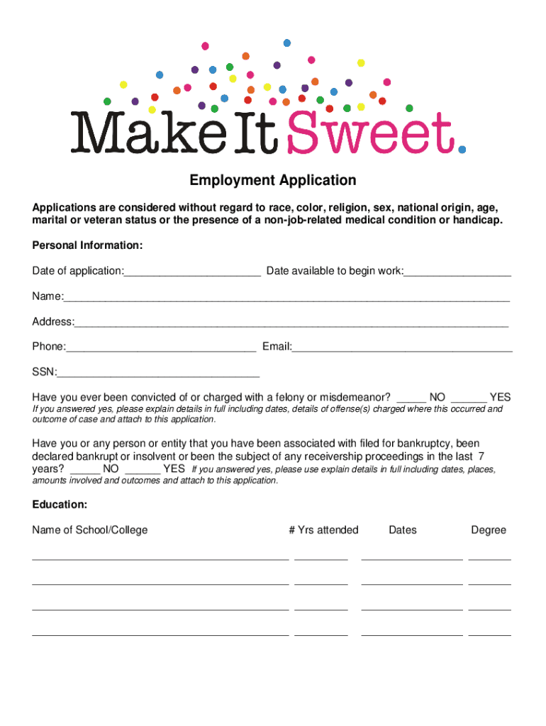Employment Application Applications are considered without regard to race, color, religion, sex, national origin, age, marital or veteran status or the presence of a nonjobrelated medical condition