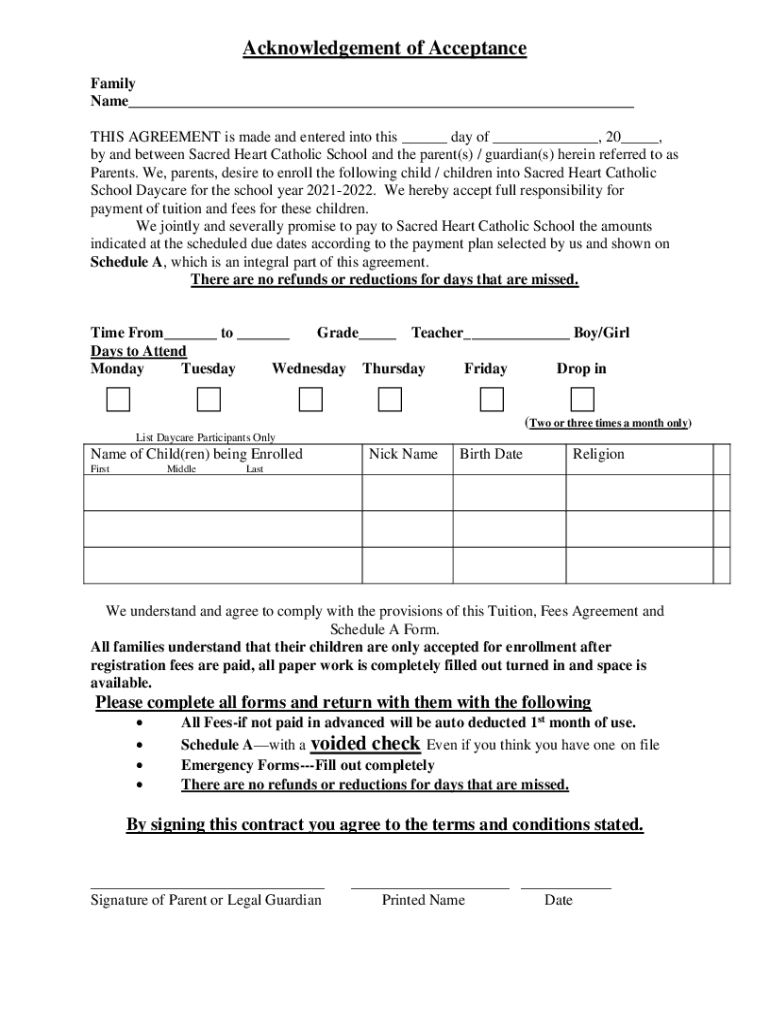 Acknowledgement of Acceptance Family Name___ THIS AGREEMENT is made and entered into this ___ day of ___, 20___, by and between Sacred Heart Catholic School and the parent(s) / guardian(s) herein