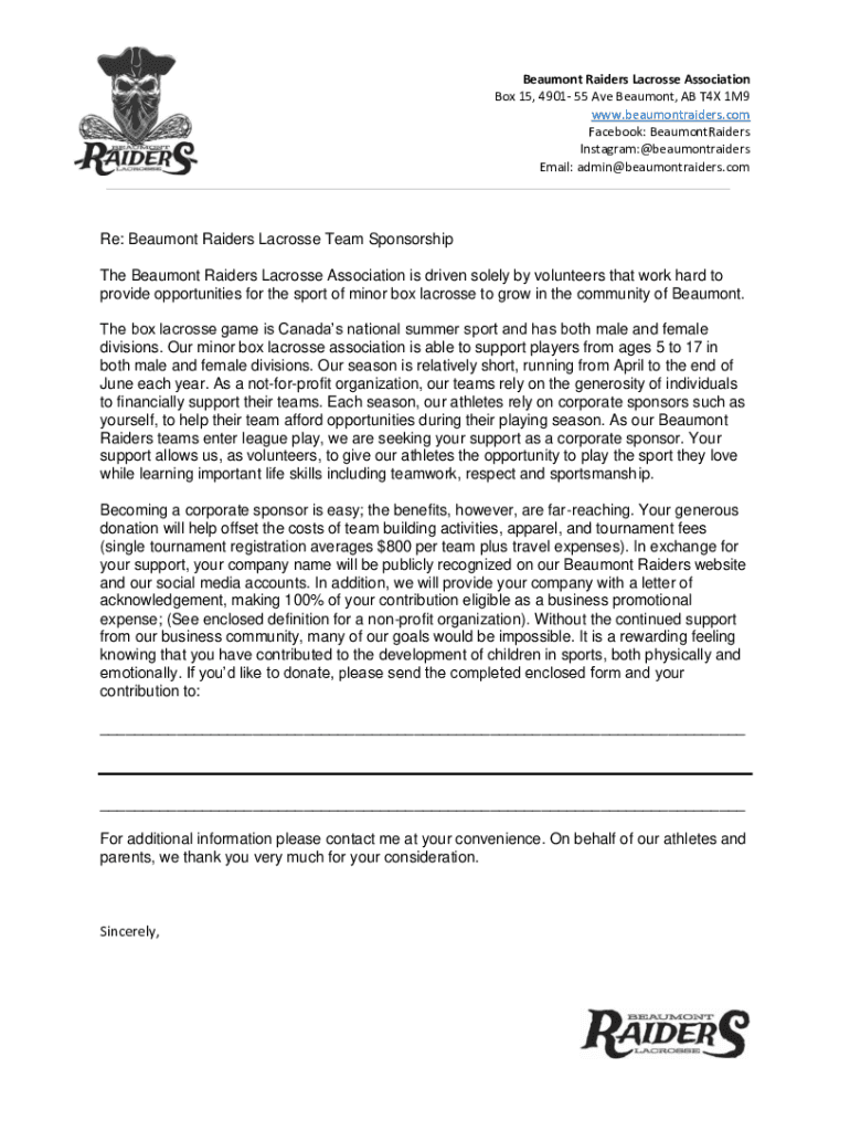 Beaumont Raiders Lacrosse Association Box 15, 4901 55 Ave Beaumont, AB T4X 1M9 www.beaumontraiders.com Facebook: BeaumontRaiders Instagram:@beaumontraiders Email: admin@beaumontraiders.comRe: Beaumont