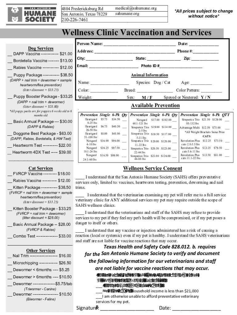 4804 Fredericksburg Rd San Antonio, Texas 782292102267461medical@sahumane.org humane.org×All prices subject to change without notice×Wellness Clinic Vaccination and Services Dog Services__ DAMP