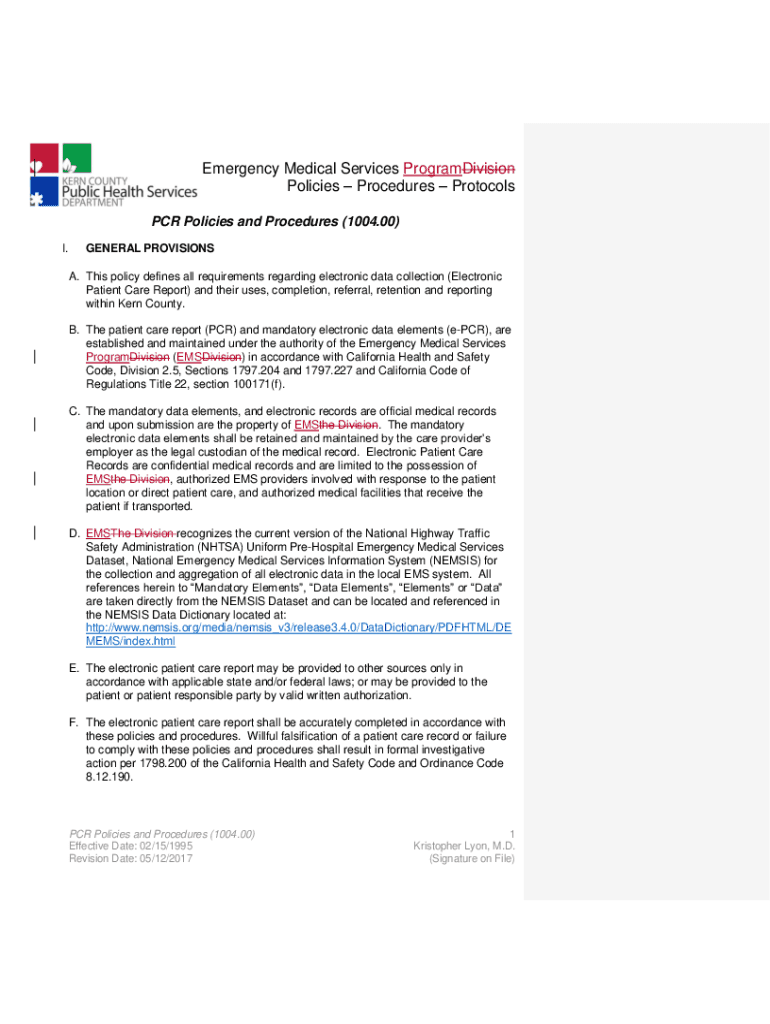 Emergency Medical Services ProgramDivision Policies Procedures Protocols PCR Policies and Procedures (1004.00) I.GENERAL PROVISIONS A. This policy defines all requirements regarding electronic data