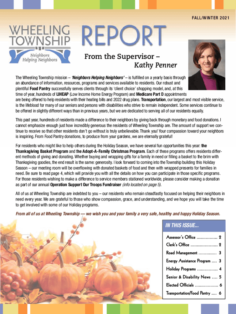 FA L / W I N T ER 2 0 2 1From the Supervisor Kathy Penned The Wheeling Township mission Neighbors Helping Neighbors is fulfilled on a yearly basis through an abundance of information, resources, programs