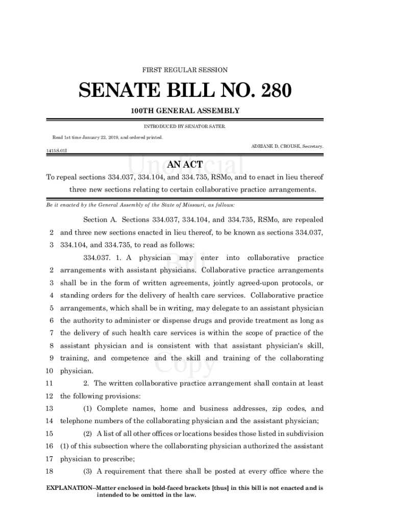 FIRST REGULAR SESSIONSENATE BILL NO. 280 100TH GENERAL ASSEMBLY INTRODUCED BY SENATOR LATER. Read 1st time January 22, 2019, and ordered printed. ADRIANE D. GROUSE, Secretary. 1415S.01IAN ACT To repeal