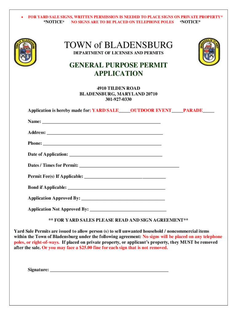 FOR YARD SALE SIGNS, WRITTEN PERMISSION IS NEEDED TO PLACE SIGNS ON PRIVATE PROPERTY* *NOTICE* NO SIGNS ARE TO BE PLACED ON TELEPHONE POLES *NOTICE×TOWN of BRANDENBURG DEPARTMENT OF LICENSES AND