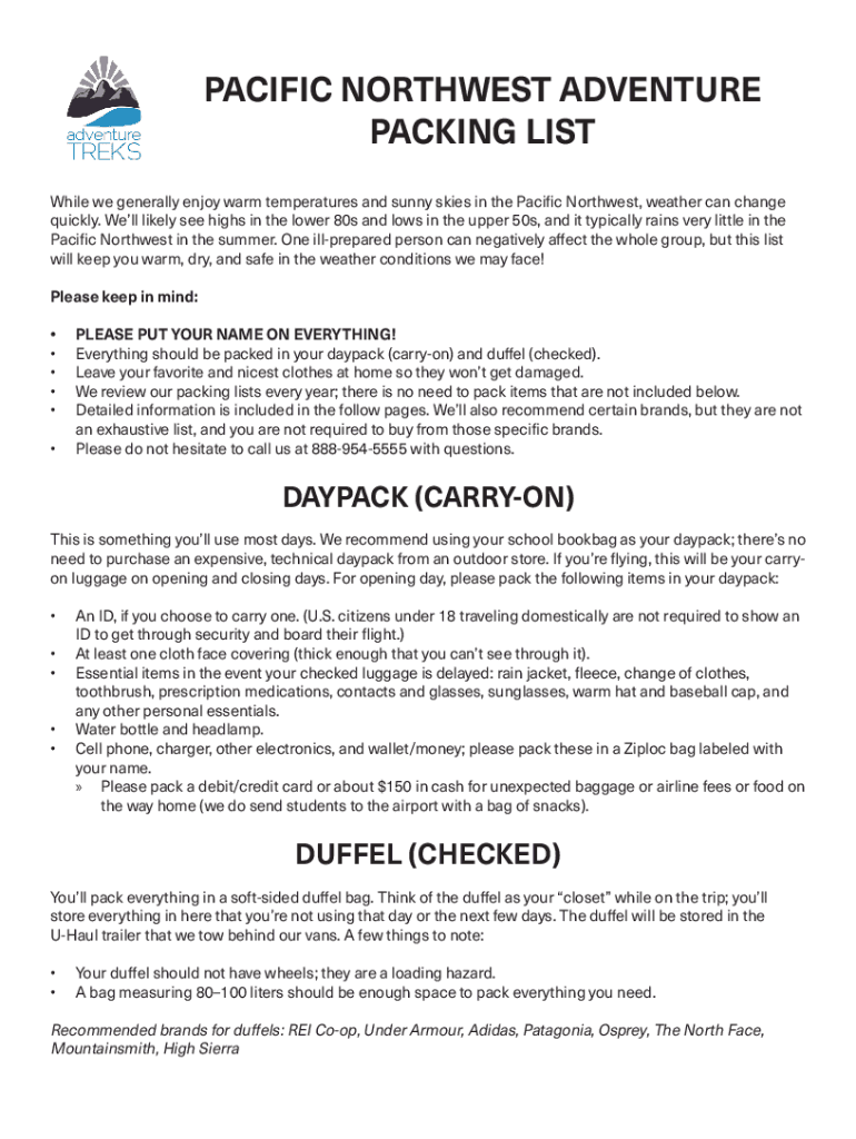 PACIFIC NORTHWEST ADVENTURE PACKING LIST While we generally enjoy warm temperatures and sunny skies in the Pacific Northwest, weather can change quickly. Well likely see highs in the lower 80s and