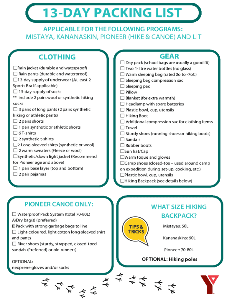 13DAY PACKING LIST APPLICABLE FOR THE FOLLOWING PROGRAMS:MIST AYA, KANANASKIN, PIONEER (HIKE & CANOE) AND LITCLOTHINGRain jacket (durable and waterproof) Rain pants (durable and waterproof) 13day