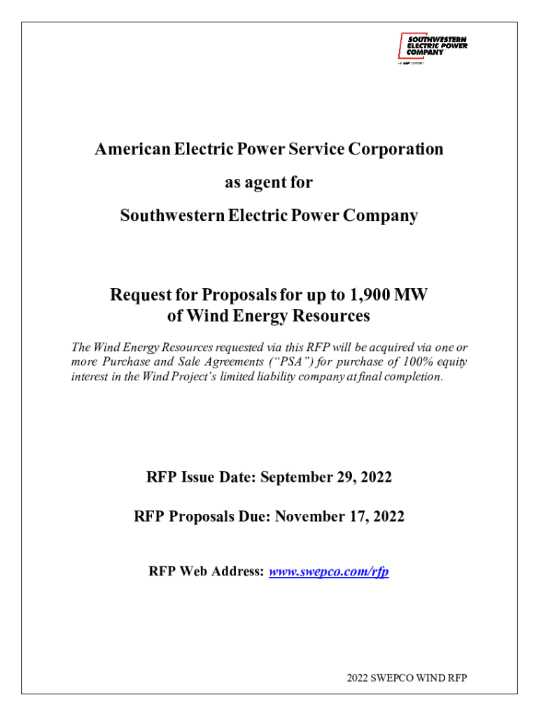 American Electric Power Service Corporation as agent for Southwestern Electric Power CompanyRequest for Proposals for up to 1,900 MW of Wind Energy Resources The Wind Energy Resources requested via