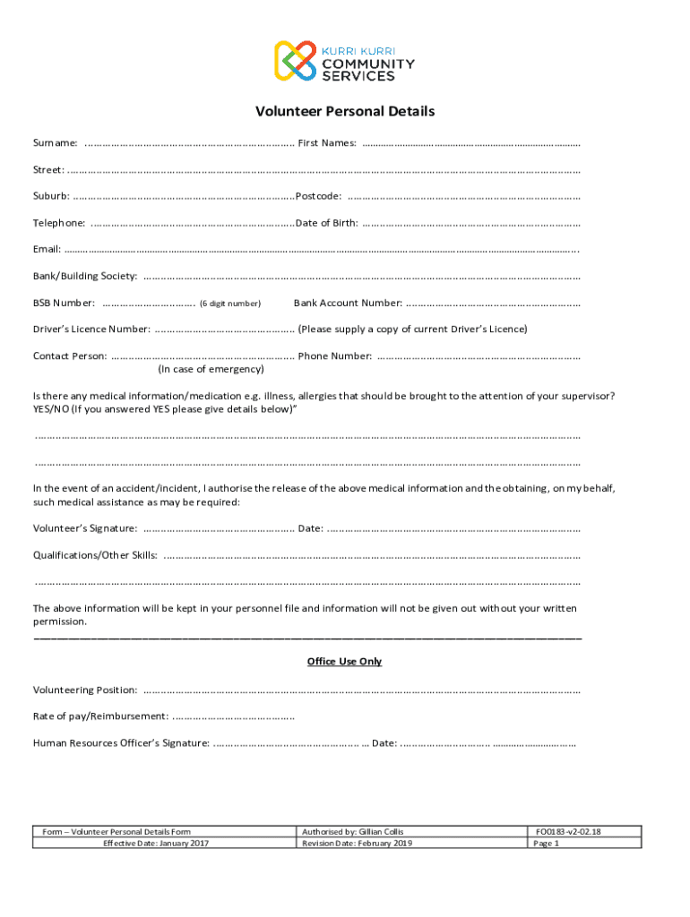 Volunteer Personal Details Surname: ........................................................................ First Names:. Street: ................................................................................................................................................................................